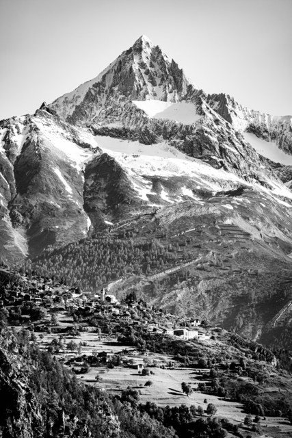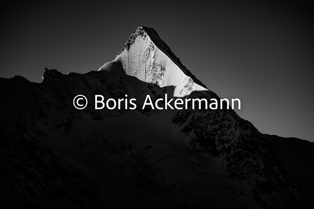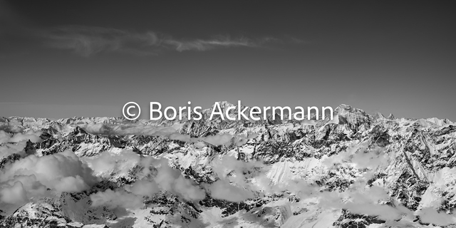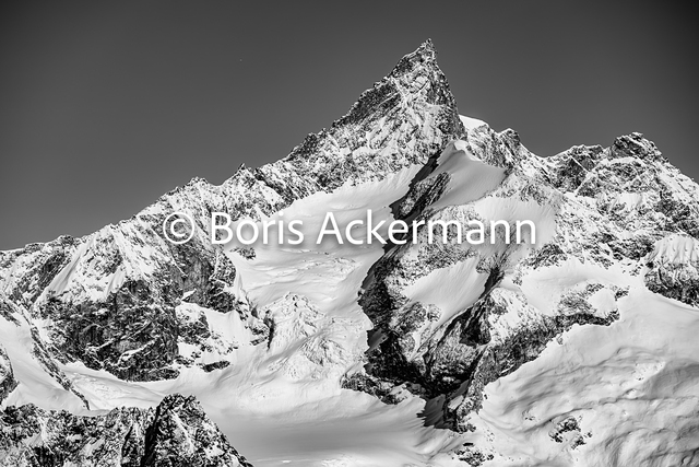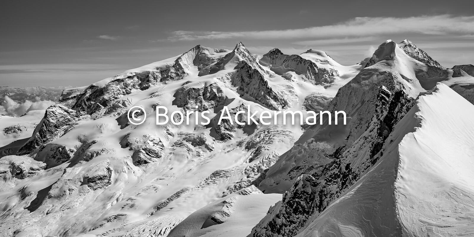Im Hintergrund dominiert das Monte-Rosa-Massiv, monumental und überwältigend, seine Gletscherflächen im harten Kontrast von Schwarz und Weiß. Starke Winde reißen Schneefahnen von den Gipfeln und verleihen der Szene eine unruhige, bedrohliche Dynamik.