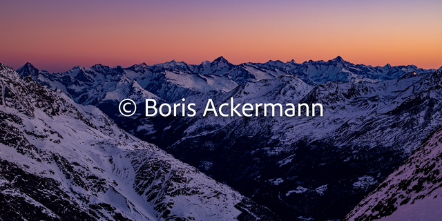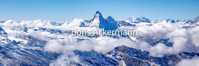 Die Aufnahme zeigt im Zentrum des wunderschönen Panoramas das Matterhorn und rechts dahinter den etwa 80km entfernten Montblanc.