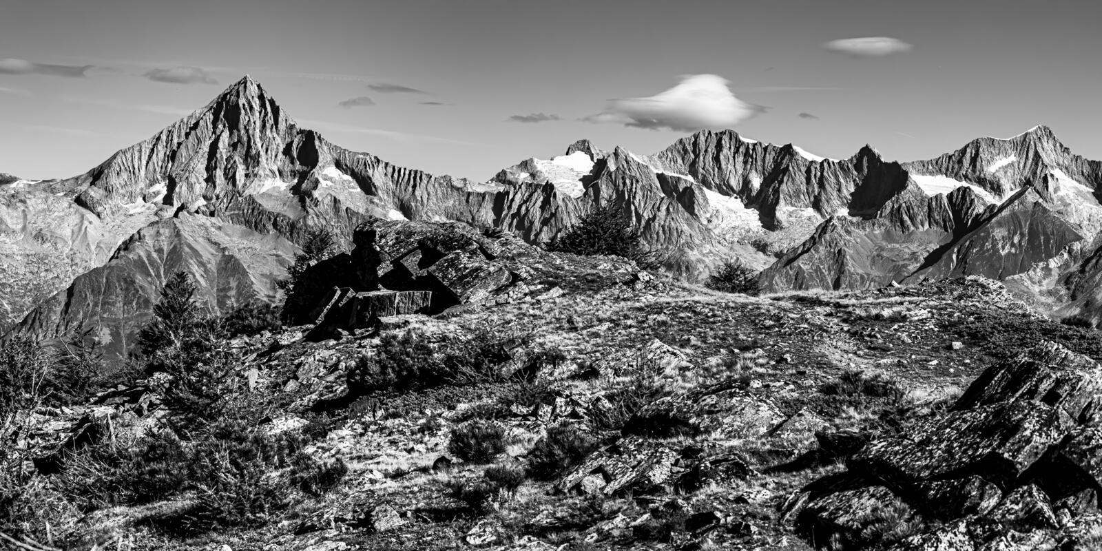 Der Blick auf Weisshorn (4505m), Brunegghorn (3831m) und Bishorn (4151m).
